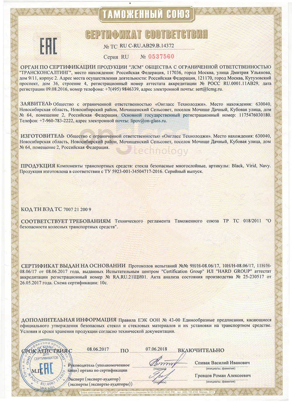 Электрохромные стекла, разработанные компанией ОнГласс Технолоджи, представляют следующее: это конструкция, состоящая из двойного стеклопакета, внутри стекол находится полимер, наружняя и внутренняя сторона электрохромного стекла покрыта атермальной бронепленкой. Таким образом, получаем триплекс, бронированный с двух сторон. Полимер, находящийся внутри конструкции, позволяет менять степень затемнения в стекле от 80% до 5% остаточной светопропускаемости.